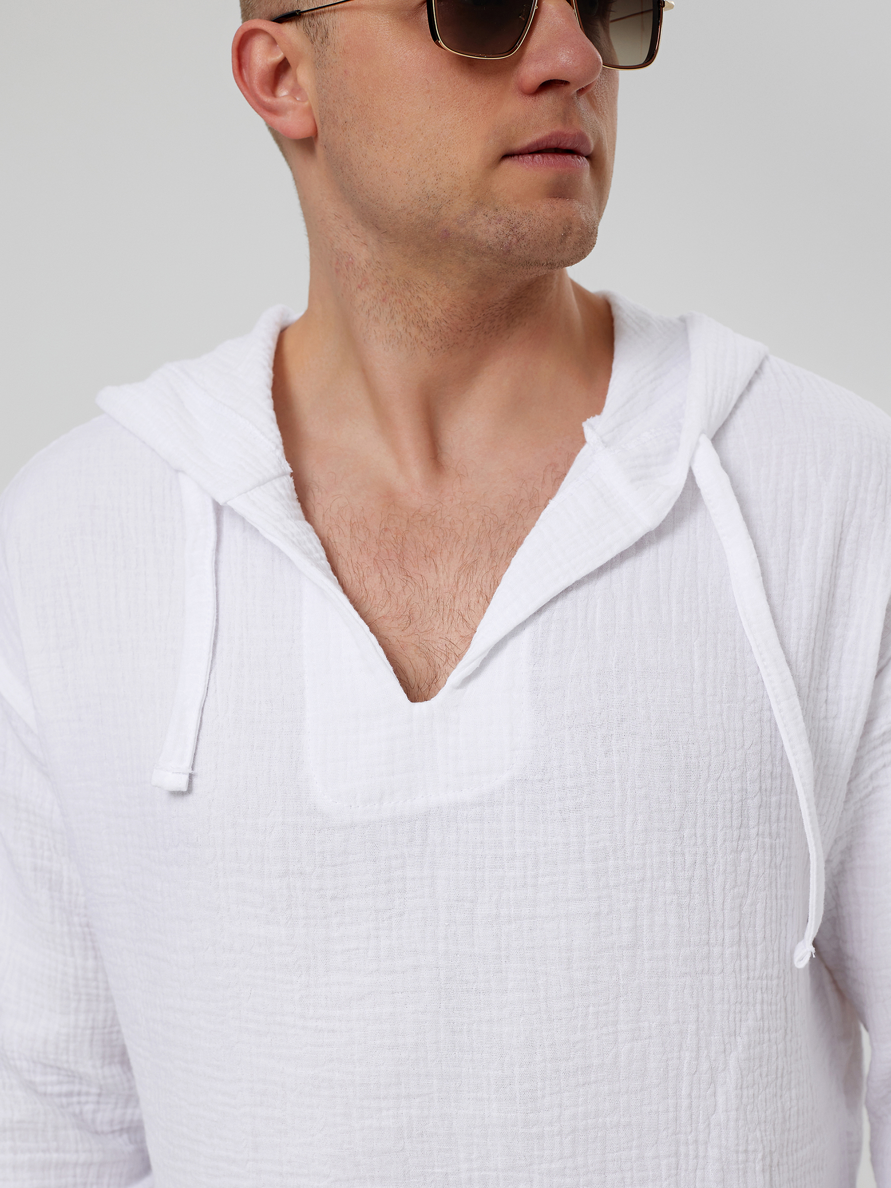 Её длинный рукав и капюшон добавляют функциональности и защиты в жаркие дни, делая эту мужскую одежду стильным и практичным решением для летнего гардероба.
